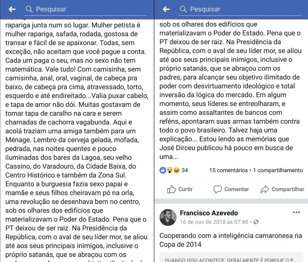 No texto compartilhado pelo delegado, ele conta sua experiência na juventude, quando fez parte da militância do PT, a partir de 1996, e mantinha relações sexuais com mulheres que também integravam o partido. Francisco Azevedo, de acordo com o texto compartilhado por ele, ainda afirma que o único que crime que ele e os demais cometiam no partido era fumar maconha.